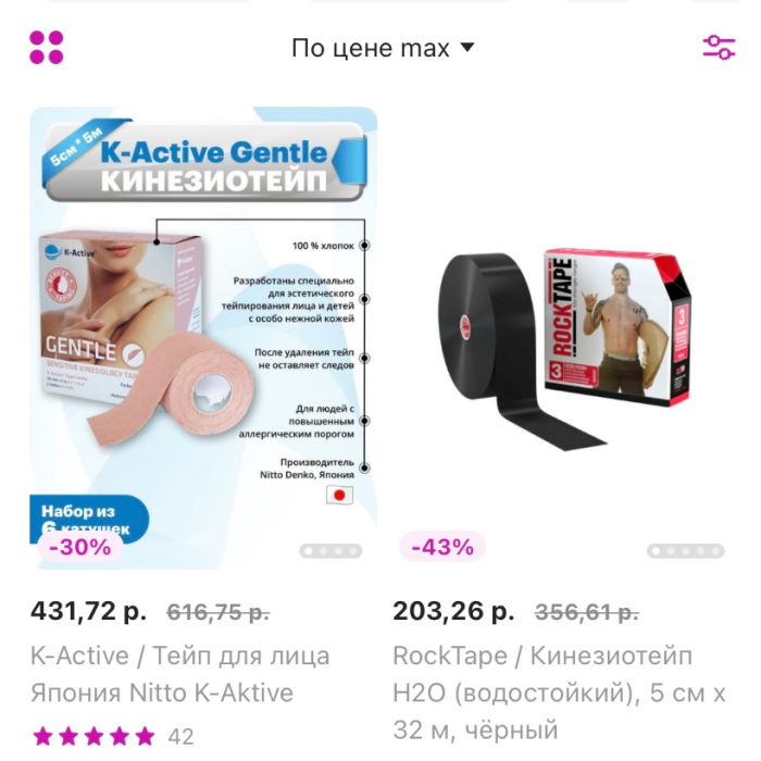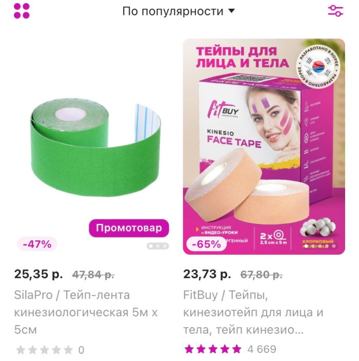 Купить тейпы можно на маркетплейсах и в спортивных магазинах. Стоимость на Wildberries начинается от 3 руб. Самый дорогой мы нашли за 214 руб. Если выбрать сортировку по популярности, то можно увидеть, что лучше всего продаются тейпы за 15-30 руб.