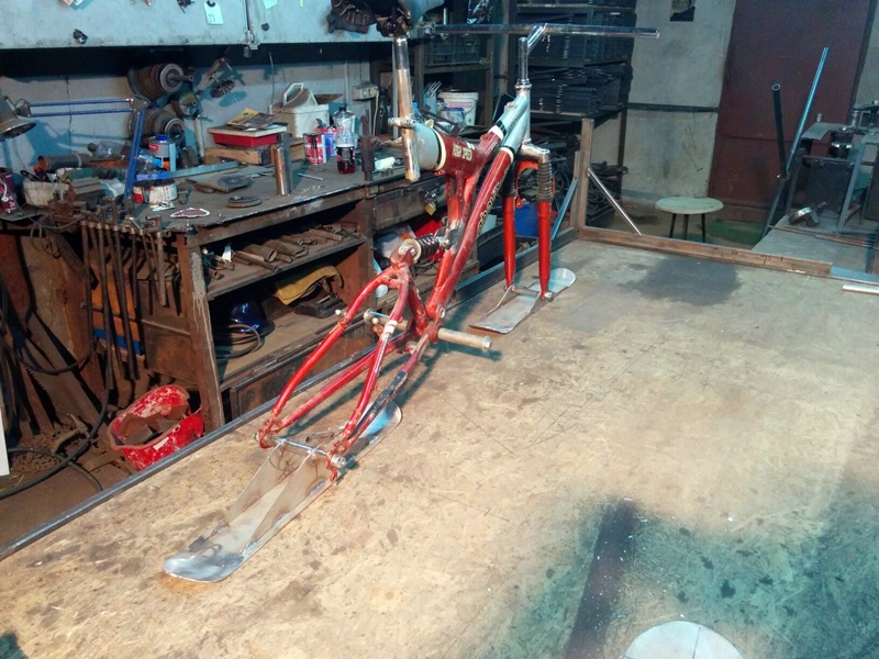 «Деревянные в экстремальных условиях легко сломать. Решил сделать железные, из нержавейки. Ось соединяющую лыжу и сам велосипед, заказал у знакомого токаря. Чтобы ногами не цеплять землю надо было поднять заднюю лыжу выше или переделать крепление заднего амортизатора. Первый вариант переделки оказался неудачный. В этом плюс работы с металлом, отрезал — переделал.