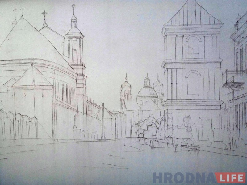 В итоговом варианте на стене можно будет увидеть центр Гродно начала XX века с ратушей, Фарой Витовта (Софийским собором) и другими постройками, которых уже нет.