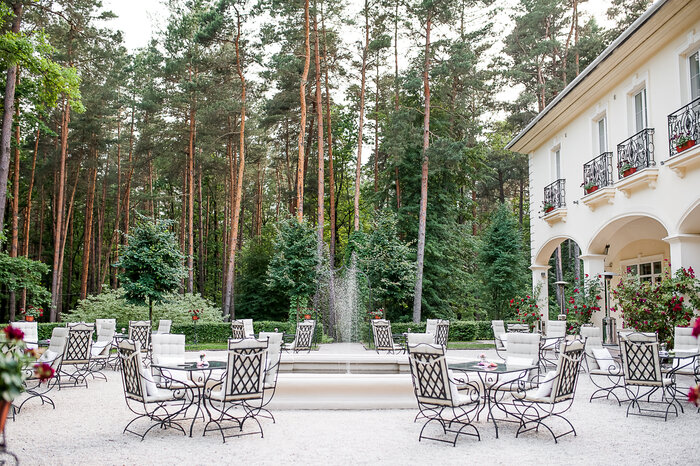 Здесь предлагают несколько мест для регистрации: площадку у фонтана, лес, лобби-бар, зал “Веранда” и главный зал. Чтобы организовать регистрацию в отеле, нужно оплатить аренду.