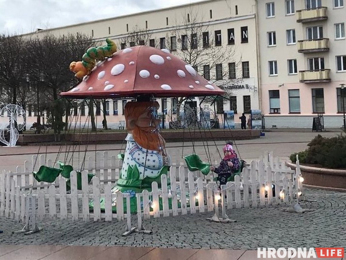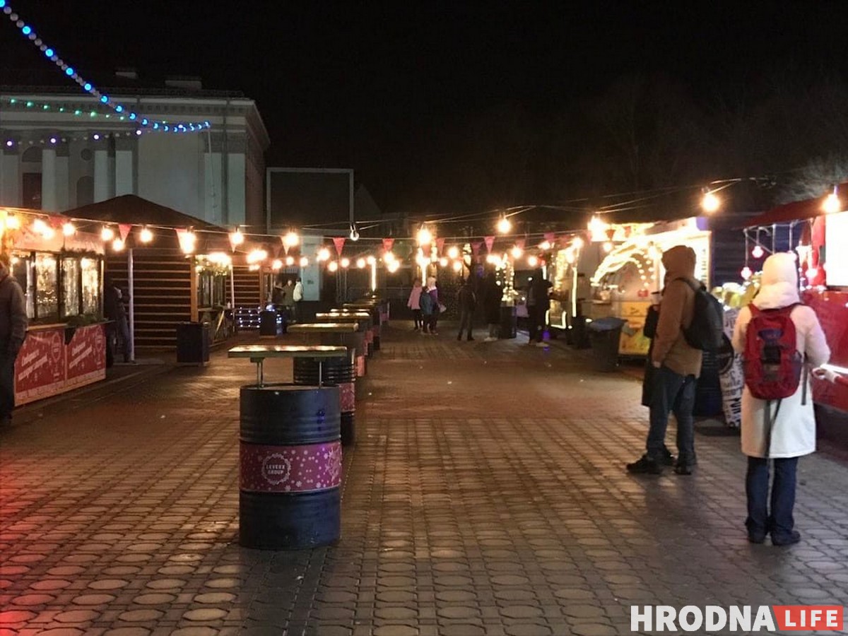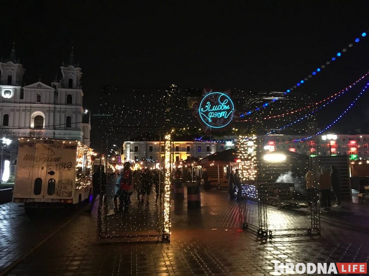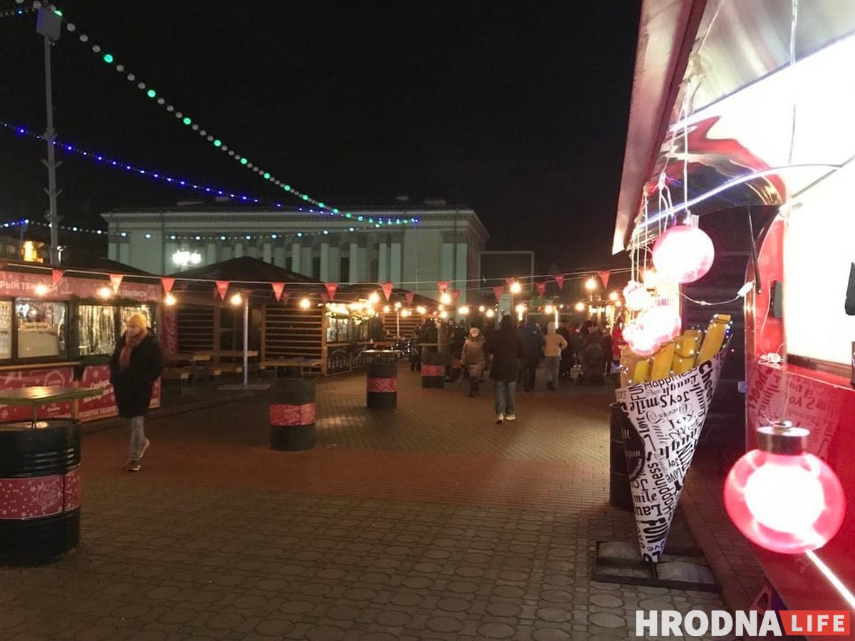 Нахохленые голуби топчутся по асфальту в поисках пропитания, пустые деревянные столы покрыты каплями воды, карусель крутит одинокого ребёнка, девушка-продавец с розовыми волосами улыбается редким прохожим. Так выглядел день и вечер на “Зімовым фэсце” в предпраздничные выходные. Фудтраки открыты, но посетителей практически нет. Что не так с зимней ярмаркой на Советской площади, пытались выяснить журналисты Hrodna.life.