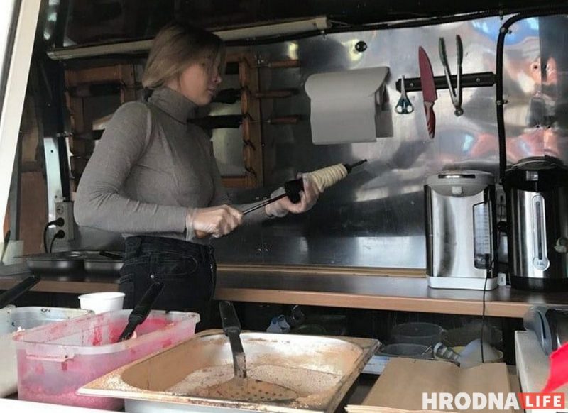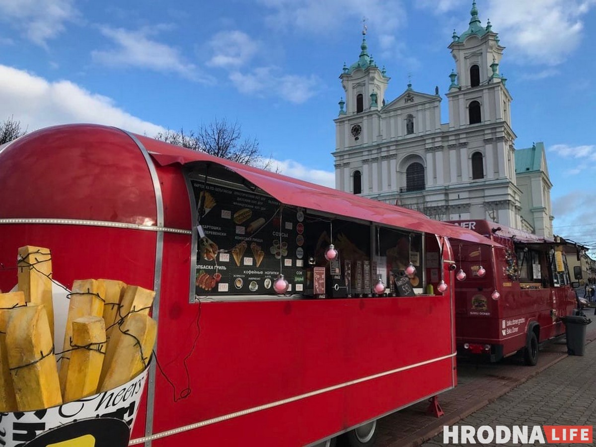 Небольшая очередь есть только возле фудтрака с трдельниками. Эти традиционные чешские булочки можно купить за 3,5 рубля. Обычно этот фудтрак стоит на набережной, внизу под Новым замком. Тем, как идёт торговля в центре, владельцы довольны. На вкус гродненский трдельник показался немного суховат. Но если купить глинтвейн или имбирно-облепиховый чай, то вполне хорошо. И после еды стало как-то уютнее и веселее.