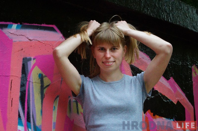 Гэта графіці на сцяне каля дома творчарці дзяцей і моладзі ў Каложскім парку спалучае ў сабе амаль несумяшчальнае — дзіцяча-бесклапотны ружовы з сур’ёзным чорным і чымсці нагадвае мульцікі. На яго фоне захацелася зрабіць такое фота.