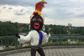 Яркое видео ростовой куклы-мулатки возле гродненского драмтеатра появилось в интернете 18 мая. Идея такого образа и танца принадлежит гродненскому коллективу «Лайт_Mix». «Идея костюма ростовой куклы…