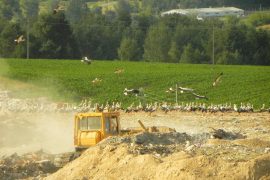 На гродненской свалке аисты живут уже несколько лет. Количество птиц со временем не уменьшается. Рядом с аистами здесь питаются чайки, серые журавли и вороны.…